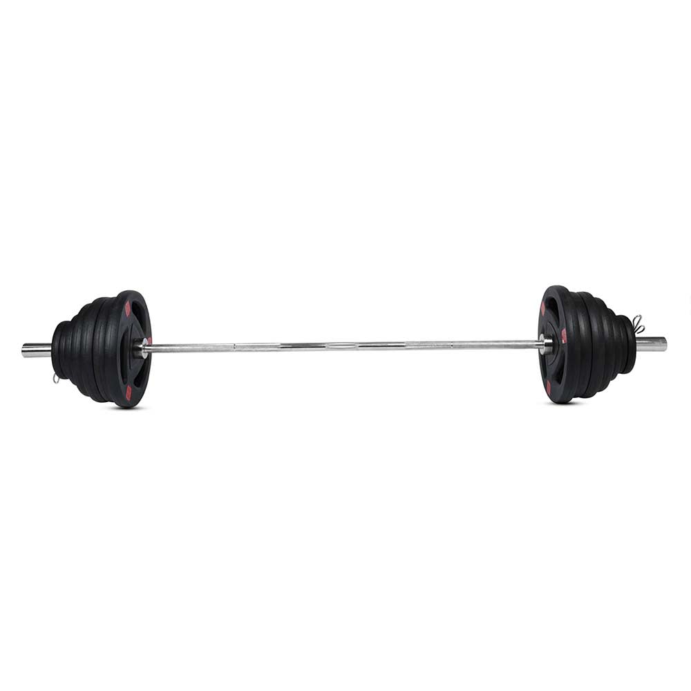 The 120 KG Barbell set with Tri Grip Rubber plates is designed to work out the whole body, from legs and back when squatting to arms and abdominal when performing chest presses.