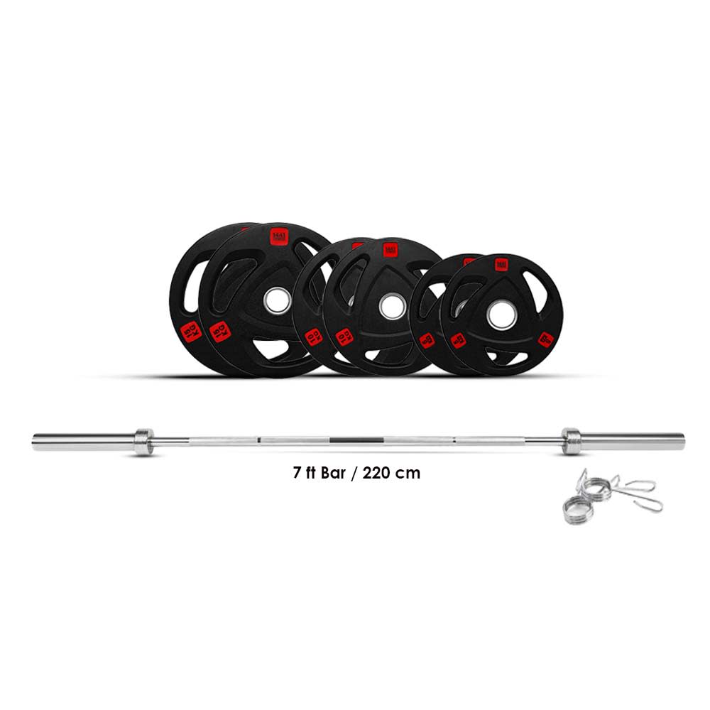 The 80 Kg Barbell set with Tri Grip Rubber plates is designed to work out the whole body, from legs and back when squatting to arms and abdominal when performing chest presses.