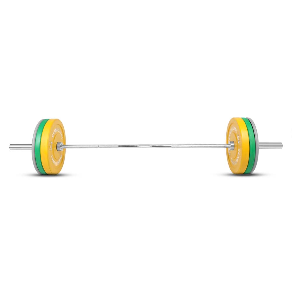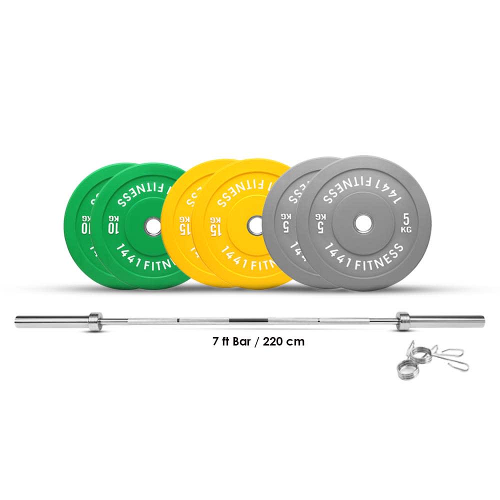 The 1441 Fitness 80 Kg Olympic Rubber Bumper Plates with Barbell is designed to work out the whole body, from legs and back when squatting to arms and abdominal when performing chest press.