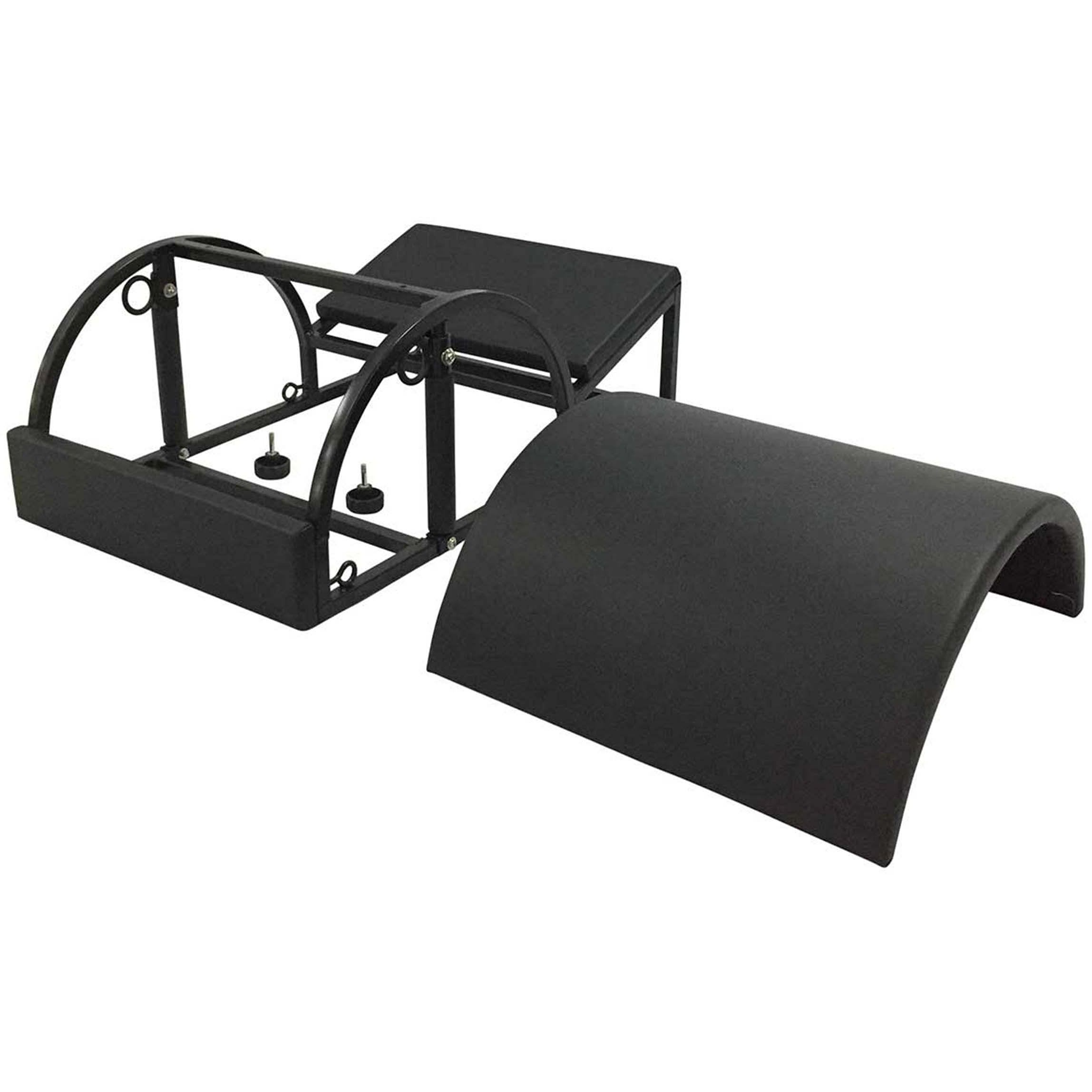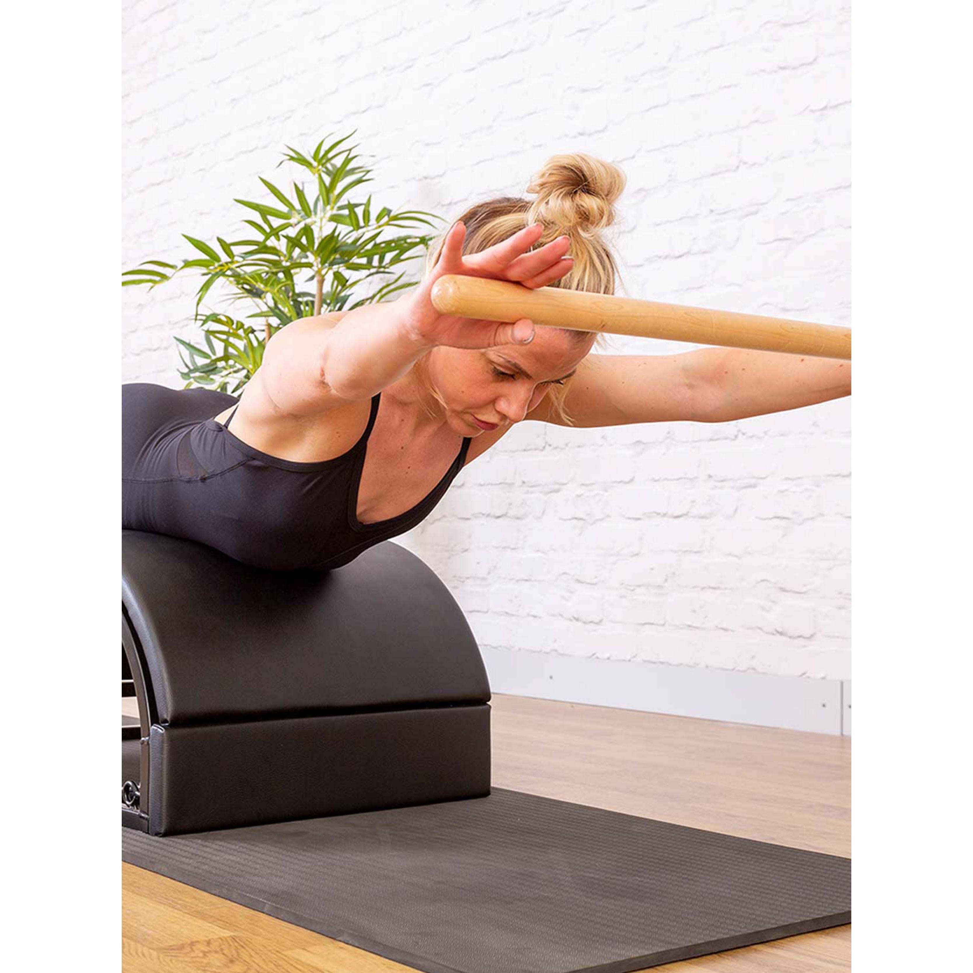 The Modular Step Barrel & Arc, also known as the "Spine Corrector," significantly extends and strengthens the back, feet, and shoulder muscles, which have long been known to help with posture by lengthening and supporting the spine. All Align-Pilates reformers have slots that fit conveniently over the shoulder rests, allowing for both reformer and floor use.