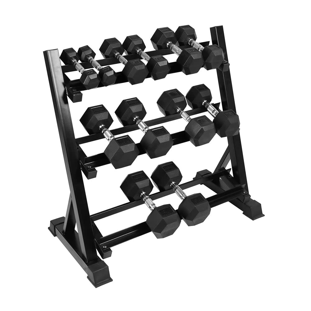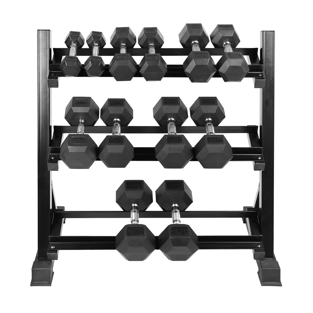 SPACE-SAVING DESIGN -The unique 3 Tier design of the rack maximizes floor space by distributing the dumbbells on three different shelves. You can now store the gym equipment on our dumbbell rack with ease after a weight training session. The varying weights of the dumbbells make it perfect for beginner to advanced level training.