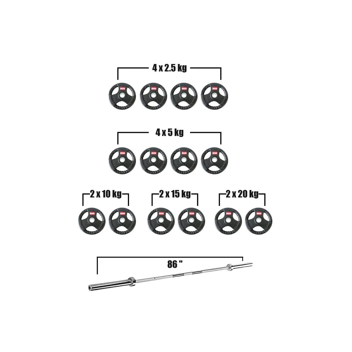 • 140 Kg:    2.5 kg x 4, 5 kg x 4, 10 kg x 2, 15 kg x 2, 20 kg x 2 / 86 Inch Bar