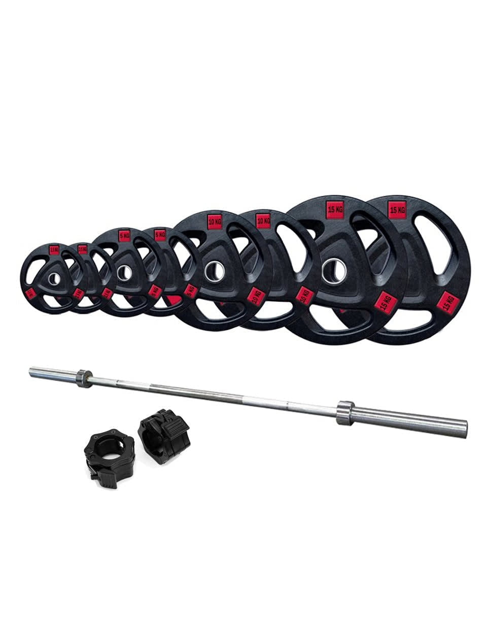 - The 80 KG Barbell set with Tri Grip Rubber plates is designed to work out the whole body, from legs and back when squatting to arms and abdominal when performing chest presses.